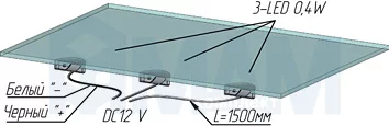 Способ установки и подключения: закрепить светильник на торцевой части стеклянной полки. Провода светильника через клеммную колодкуподсоединить к блоку питания, далее подключить к 220 В.
