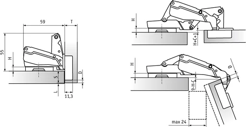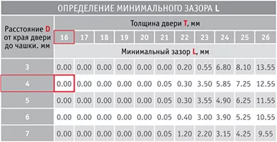 T – толщина двери; B – толщина боковины; С – изгиб плеча петли;