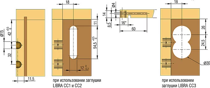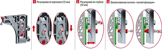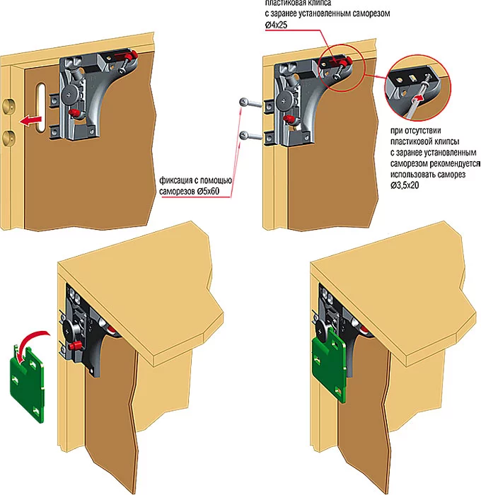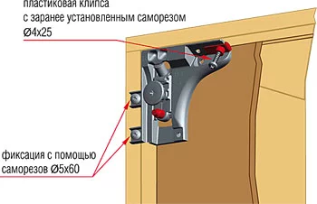 Монтаж: на два полукруглых штифта Ø15 мм с пластиковой клипсой и саморез для крепления к верхней части короба (штифты и саморезы в комплекте)