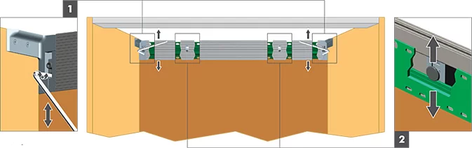 | A Регулировка по вертикали – 15 мм | B Регулировка по глубине – 15 мм и система фиксации короба на рейке | C Регулировка угла наклона короба |