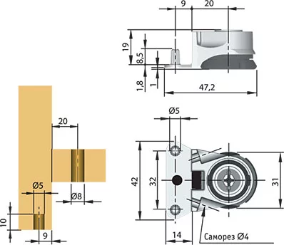 - на опоре имеются два шипа, которые фиксируются на торце боковины каркаса без предварительного сверления; возможна дополнительная фиксация саморезами;