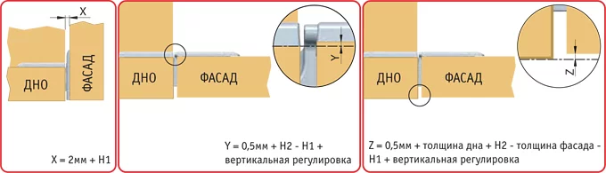 - одинаковые размеры сверления (диаметр 26 мм) в дне и в фасаде;
