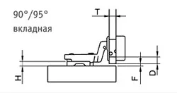 ![]() S – наложение; H – высота устан. площадки; L – миним. зазор; T – толщина двери; B – толщина боковины; С - изгиб плеча петли; D - расстояние до чашки петли; F – фактический зазор. | Расчет высоты площадки H:![]() |