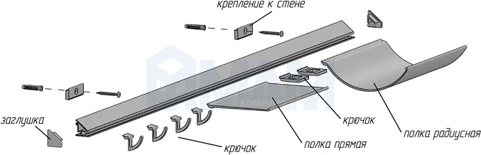 Комплектация: рейлинг 900 мм, заглушки для рейлинга, комплект крепежа, полка прямая,
