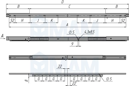 | Длина механизма в закрытом состоянии, мм | Размер крепежной площадки, мм | Расстояние между каретками, мм | Длина механизма в открытом состоянии, мм | Присадочные размеры, мм | Артикул | |||