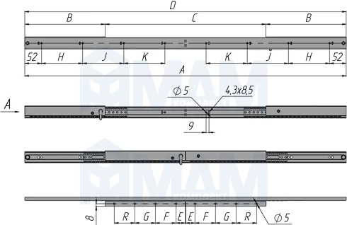 | Длина меха- низма в закрытом состоянии, мм | Размер крепеж- ной площад- ки, мм | Расстоя- ние между карет- ками, мм | Длина механиз- ма в откры- том состоя- нии, мм | Присадочные размеры, мм | Артикул | ||||||