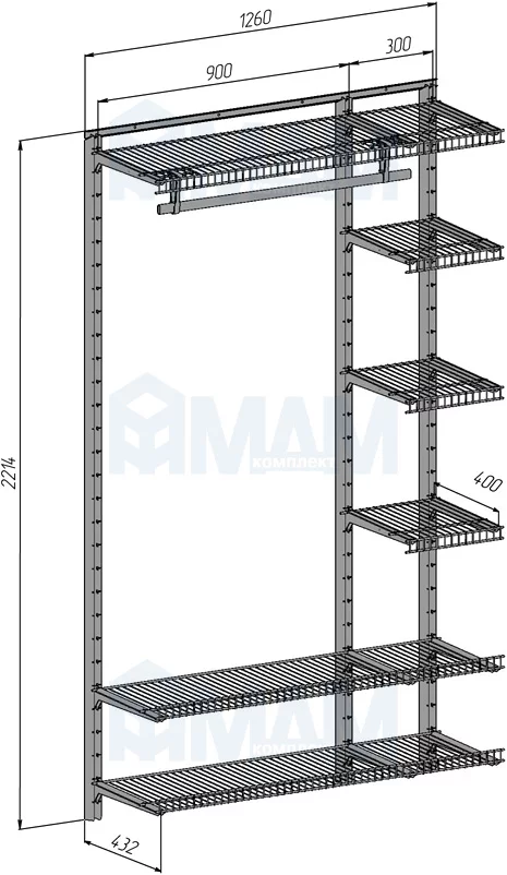 Примечание: от сетчатой полки арт. HS400*1250MT необходимо отрезать 3 части по 350 мм каждая, чтобы получить полки для проёма 300 мм