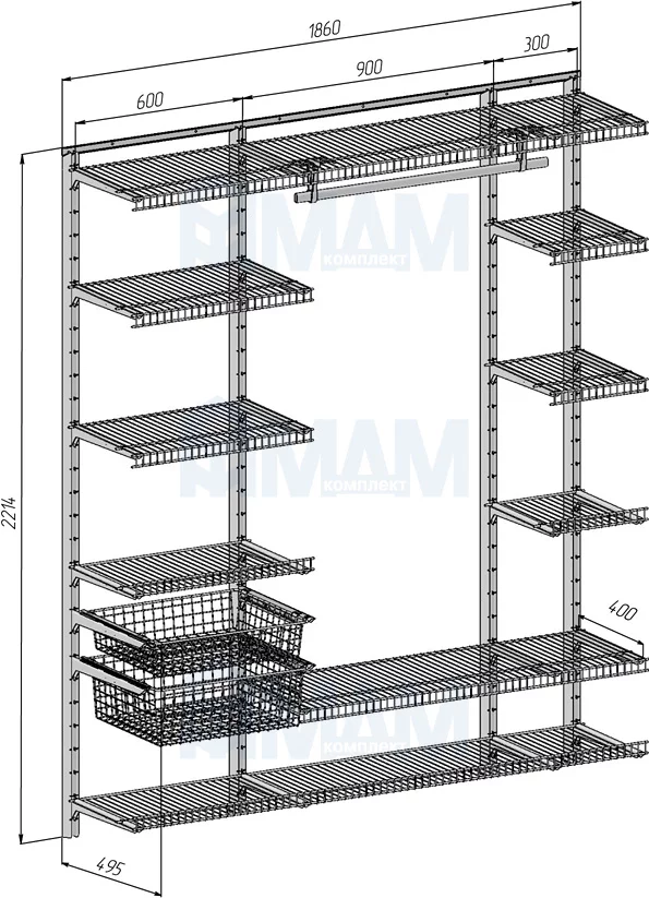 Home Space, гардероб ширина 1860мм, глубина 495 мм, 3 проема по 900 мм, 600 мм, 300 мм: HSK1860x495MT1