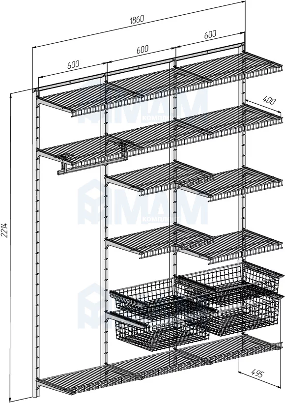 Home Space, гардероб ширина 1860мм, глубина 495 мм, 3 проема по 600 мм: HSK1860x495MT7