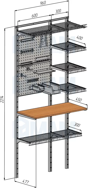 Примечание: от сетчатой полки арт. HS400*1250MT необходимо отрезать 3 части по 350 мм каждая, чтобы получить полки для проёма 300 мм