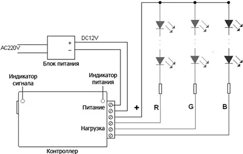 • Подключите провода от светодиодной ленты к выходным клеммам RGB контроллера.• Убедитесь, что выходное напряжение используемого блока питания соответствует напряжению питания контроллера и ленты.