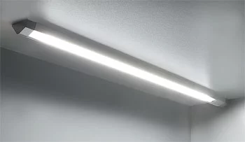 - наклонная геометрия — световой пучок светильника смещен на 45° относительно вертикали, это значит, что даже при установке светильника вдоль задней стенки верхнего яруса кухни, он будет освещать середину столешницы;