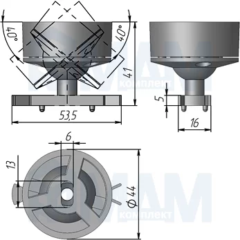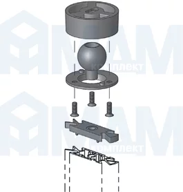 Комплектация: база на профиль, основа крепления к потолку, шаровый элемент, внешняя крышка опоры, 3 винта, 2 самореза, дюбель