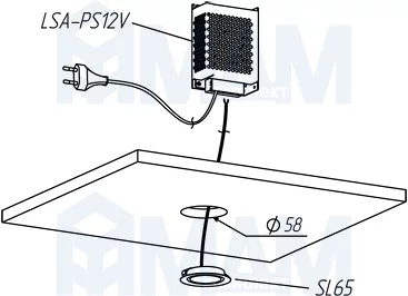 Способ установки и подключения: подготовить установочное отверстие 58 мм, закрепить в нем светильник. Затем через блок питания подключить светильник к сети 220 В.