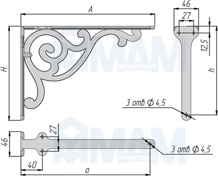 | Менсолодержатель | A, мм | H, мм | a, мм | h, мм | W, мм |