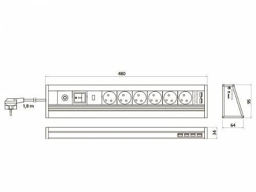 GTV: Удлинитель настольный MULTI, 6 розеток SCHUKO, 4хUSB-порт, 2 зарядка USB 5V 2A, трансформатор AE-PBMUL6S6U-53